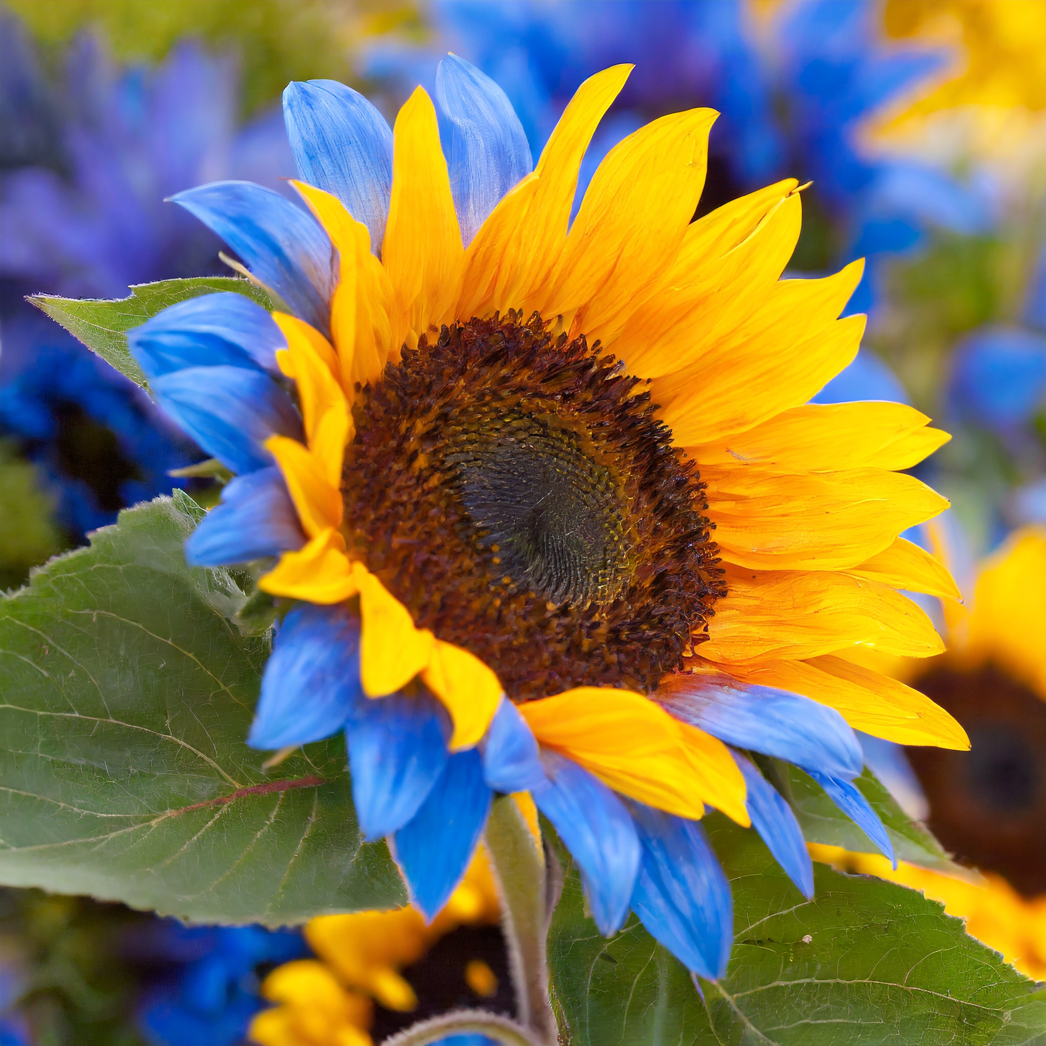 These sunflowers are a testament to the artistry of nature! The melding of blue and yellow petals within twin blossoms produces an enchanting visual symphony that will leave you utterly captivated. It's like sunshine and sky meeting in a bloom, twice as enchanting! 🌻🌈